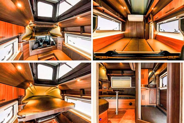 Alapesetben a nagyszobát étkezőhelyiségnek vagy nappalinak lehet használni, összecsukható asztallal és 2 ülőpaddal. A nyitható tető lehetővé teszi, hogy kiegyenesedve állhassanak bent felnőttek, és hogy rengeteg természetes fény jusson be. Az egyedileg választható színű belső térben a fából készült burkolatok, a csempe-stílusú padló és a hangulatvilágítás teremt otthonos atmoszférát. Könnyen átalakíthatók az étkezőpadok egy 2,3 méter hosszú franciaággyá, amely felnőttek számára is kényelmes, míg a másik, 1,66 méter hosszú, 2 gyerek számára tervezett ágy a tetőrészből hajtható ki. Mindkét oldalon van egy-egy ablak, felettük pedig több tárolórekeszt, szekrényt, ruhaakasztót és törölközőszárítót alakítottak ki, még beépített hűtőszekrény is van.