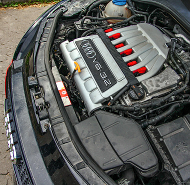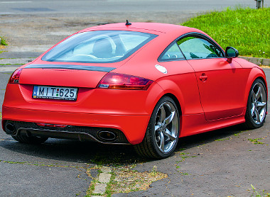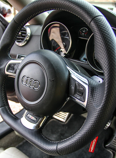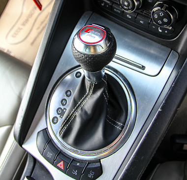 A váltógomb is a jobban felszerelt típusfivérből származik Tehát átfóliázták az autót, a pirossal jól mutat a fekete vagy a sötétszürke, ezen elv alapján az első koptatókat, a tükröket és a kis kiemelkedő hátsó spoilert valódi karbonszövettel vonták be. A szépen felvitt szövetet lakkozzák, ettől ilyen jó a kinézet. A sötét tónus kontrasztot ad a piroshoz, és ugyanilyen hatásosak a matt felület ellenpárját adó polírozott elemek – a tanksapka és a felnik. Utóbbiak gyári 19 colos Audi keréktárcsák, amelyekre 255/35-ös gumikat szereltek fel.