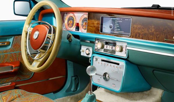 Az utastérben egészen jól álcázták a BMW műszereket, de furcsán néz ki a retrós környezetben a központi kijelző, amelynek a grafikájához már nem nyúltak, még a színvilágot se módosították. Egyébként az új autó összes kényelmi és biztonsági berendezését megtartották az átépítés során, csak a hangulatot módosították.