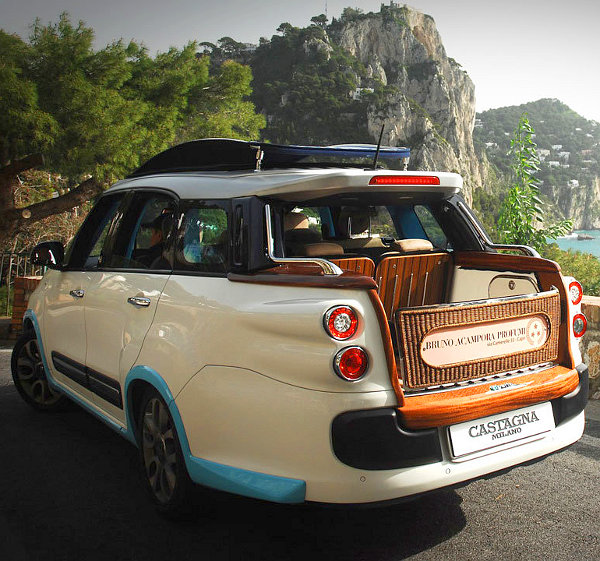 Az olasz Capri szigetén hagyományosan a tetejüktől megszabadított autókkal fuvarozzák a turistákat, a Castagna manufaktúra legújabb alkotásán azonban a változó kor igényeinek megfelelően nem skalpolja meg a Fiat 500L karosszériáját, hanem meghagyja az utastér feletti tetőt napvitorlával kiegészítve, így a légkondicionáló kellemes hűsét is élvezhetik az utasok. De azokkal se akartak kiszűrni, akik inkább a napfényen sütkéreznének, ezért bő fél méterrel megtoldották az egyébként is nagy méretű hátsóval rendelkező Fiat 500L befejezését, itt alakították ki a nyitott fedélzetet.