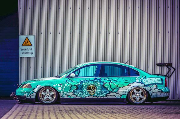 Érdekes átkötés, hogy ez a Passat még nem teljesen készen a budapesti AMTS-en mutatta meg magát először az értő nagyközönség előtt. Egy év munka után ugyanis addigra állt össze Daniel Volkmar autója. A német srác korábban sem szalonállapotban használta, alaposan leültetve, nagy kerekeken gördült vele, de még messze az átlagembereknek elfogadható szinten tartotta a kocsit – amíg össze nem jött a Sauberkraut tuningcsapattal…