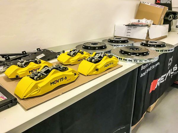 Megrendeltek a Movit cégtől előre hatdugattyús féknyergeket és 400 mm átmérőjű hűtött, perforált féktárcsákat, hátra pedig négydugattyús nyergek és 380 mm átmérőjű tárcsák kerültek. A nagyobb súrlódó- és hűtőfelület, valamint a jobb hőegyensúly megtette a hatását. Fékezéskor sokkal szebben adagolható a fékerő, az elmelegedési vibrációs jelenség is a múlté már. Fékbetétként a Movit Street Comfort betétjeit szerelték be, amelyek 500 Celsius- fokos hőterhelésig jól teljesítenek. Ugyan van a Movit cégnek egy 900 Celsius-fokot is bíró betétje (Pro Endura), azonban az utcai körülmények között túlzás, klubsportot űzőknek lehet jó választás.