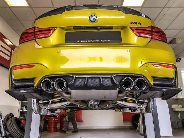 Lépjünk is tovább, hol finomítható még egy ilyen szintű autó? Hát például a kipufogónál. Az okkult tuning egyik mai sztár gyártója az Akrapovic. Nagyon klassz holmikat dobnak a piacra, az M4-hez is kínálnak teljes készletet. Esetünkben a végdobot (és csöveit), valamint a rendszer középső részét cserélték. A végdob „Slip-On Line” néven fut, titániumból készül, így 3 kg-mal könnyebb a gyári acéldobnál. Fojtószelep-szabályzású, ezzel módosítható a torlónyomás, illetve párhuzamosan a kipufogó hangzása. A középső szakasz tartalmaz egy kis dobot, de a gyárinál kisebb az áramlási ellenállása. Az Evolution Link névre hallgató középrész is titánötvözet, 4,1 kg-mal könnyebb a gyárinál. A gyártó szerint a két kipufogótaggal 17,5 LE teljesítmény és 33,4 Nm nyomaték szabadítható fel. Gábor megerősítette, hogy ez valóban így van, de egy 431 lóerős autó esetén még virtuózabb utcai használat esetén sem azonosítható a többlet. Ahhoz versenypálya, profi sofőr és stopper kell.
