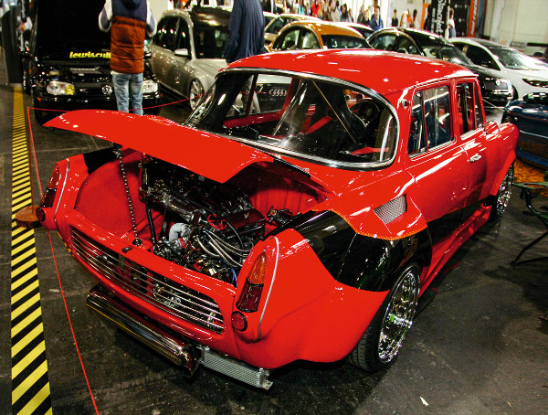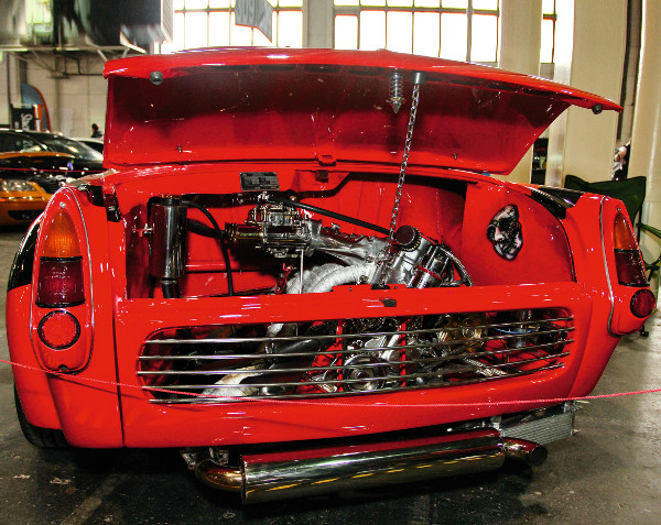 A hátsó szélesítés mértékét jól mutatja a „szellőztető alagút” A motortér ugyancsak izgalmas. Már nem a régi 1,0 literes dolgozik itt, hanem egy 1360 köbcentisre felfúrt blokk, amely az új alkatrészek által 100 lóerőt teljesít. Egyedi a szívó- és a kipufogócsonk, a keverékképzést két Dellorto 40-es karburátor látja el, amelyek K&N sportlégszűrőn át kapják a levegőt. A motor a klasszikus gépésztuning képviselője, hegyes vezérműtengellyel, polírozott szívócsövekkel, könnyített lendkerékkel, köszörült hengerfejjel, új, keményre edzett felületű szelepekkel. Természetesen egyedi a kipufogórendszer is.
