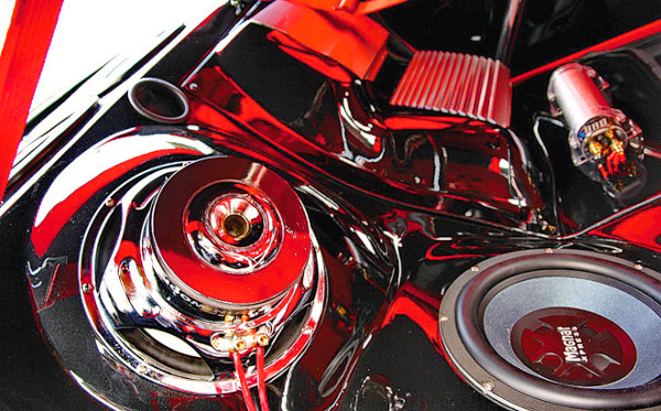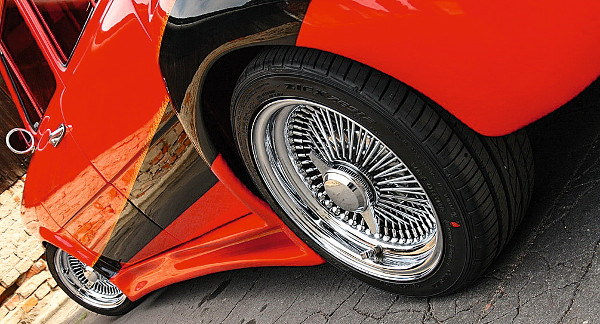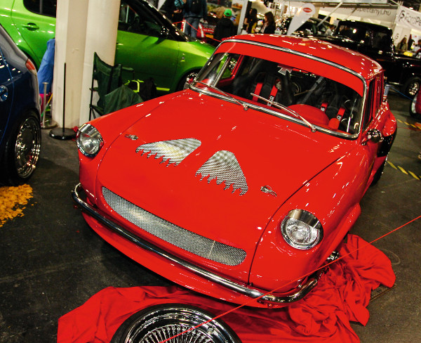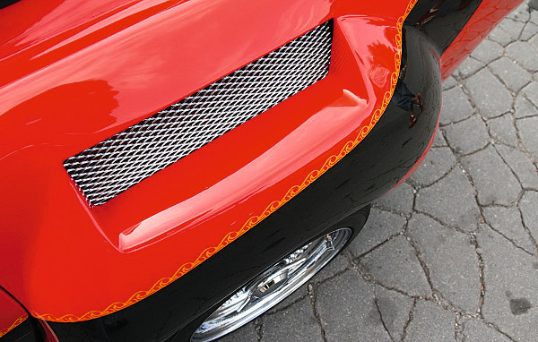 Békaszemek, légbeömlők és glanc kinézet. Kevesen mentek el mellette fejforgatás nélkül A kész karosszériát vörösre fényezték, majd ment rá egy flip-flop réteg. A kocsi gyöngyházfekete díszcsíkot kapott, a két szín találkozásánál pedig airbrush fut végig. A kész fényezést két réteg védőlakkal fújták le. Ezután jöhettek a díszítések, mint a fényszóró szempillája, vagy a Sandtler Classic króm visszapillantók.