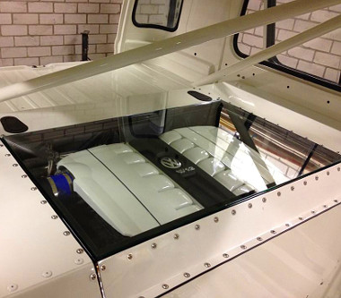 A legnagyobb változás, hogy a boxer-farmotor helyett egy W12-es középmotor dolgozik a gépben, egyben felszámolja a rakteret is. Még fölé se lehet nagyon pakolni, hiszen egy ablakot helyezett el az építő az erőforrás fölött. A 6,0 literes lökettérfogatú W12-eshez egyébként nem nyúltak hozzá, erre nincs is szükség, az eredeti 44 lóerős teljesítményt így is megtízszerezték, 450 lóerő hajtja a hátsó kerekeket.