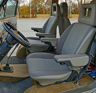 Az eredetileg nyolcszemélyes buszt hétszemélyesre alakította a második üléssorban lévő két karfás üléssel. Minden egyéb belső felszerelés eredeti, vagy annak felújított változata. A gyári Volkswagen szövetet Csepelen vásárolta, de felújították a tetőkárpitot és az üléseket is.