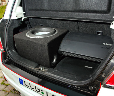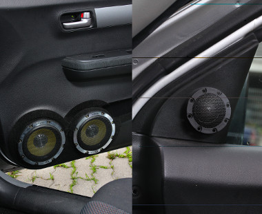 Hátul lakik két Vibe Slick erősítő, az egyik hajtja a mélyládát, a másik a két első szettet. Utóbbiak márkája is Vibe, felülre építettek be oldalanként 1-1 csipogót, a térképzseb helyére pedig oldalanként 2 mélyközépsugárzót.
