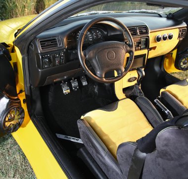 Az igazi átalakuláson 2011-ben ment át a Calibra. Darabjaira szedték és újra összerakták, persze a kor elvárásaihoz igazodva. Ami mindent túlélt, az a Rieger Catano szélesítő szett: extrém széles a kocsi, hátul 34 cm a hozadék (6-6 cm vastag nyomtávszélesítő tárcsa van a felnik alatt). Elöl 16 cm a ráadás, és 2-2 cm az itt szolgáló nyomtávszélesítő.