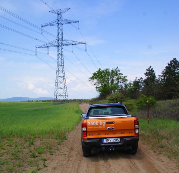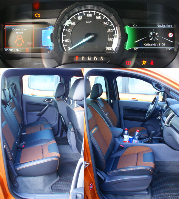 Az épített tereppályán is felakad néha a küszöb Mondjuk amennyire az úthibákon dobált, annyira könnyedén lépett át a földutak bukkanóin, szóval vegyes felhasználásra készítették a felfüggesztést. Az utastér is hibrid, a klasszikus pickup és a legmodernebb személyautós elemek ötvözéséből rakták össze, részben monitor helyettesíti a műszeregységet, de azért sok helyen érezni, hogy eredetileg strapabíró munkagépnek szánták a konstrukciót. Például a műszerfalon békésen megfér egymás mellett a narancs díszvarrásos bőr és az olcsó műanyag. Slauggal mosni nem érdemes a bőrkárpitos belsőt, csak zárlatos lesz az elektromos ülésállítás, egyébként 80 cm-es a gázlómélység, szóval a másik irányból jöhet a víz nyugodtan. Bár valószínű, kőkemény terepjárás helyett – csak a hátsó diffi lehet zárható, az is csak felár ellenében – inkább aszfalton fogja leélni életét az általunk próbálthoz hasonló fullos Ford Ranger, a 3,5 tonnás vontatási képességének köszönhetően a hajó- vagy lószállító utánfutót is elbírja.