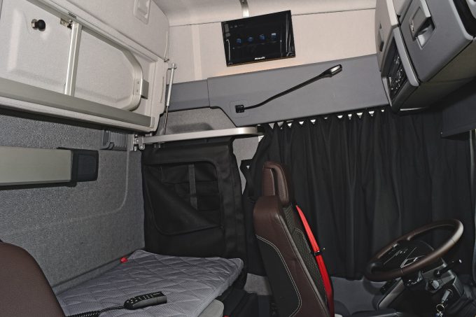 Már kívülről is szembetűnő a fülke szokatlan fizimiskája: döntött szélvédő, előrefelé keskenyedő trapézforma, lekerekített tető. Noha a beltérből csípnek le egy-egy centit itt-ott, sokat számítanak a légellenállás csökkentésében. Csakúgy, mint az oldalburkolatok az alvázon, a kiegészítő ajtótoldatok, vagy épp az első lámpákba épített légterelő. A tetőspoiler elektromosan állítható, az oldallégterelők pedig behajthatók. Fontos ez, mivel nagyon sok múlik azon, mennyire sikerül eltüntetni a vontató és a pótkocsi közötti rést.
