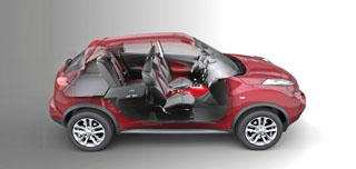 Nagyobb testvéreivel ellentétben a Qazana-tanulmány által „előmelegített” Juke kevésbé SUV-jellegű, jó adag kupés sportosságot is elegyítettek a formába. Elég megnézni a hátrafelé erősen keskenyedő ablaksort, amelynek vonalait kiemeli a köré húzott fekete árnyékvonal. Ebben rejtették el a hátsó ajtók kilincseit is, amely már bevált autóipari fogás egy sokajtós autó kupés jellegének hangsúlyozására. Persze, ennyiben azért nem merül ki a Juke formai gegparádéja. Itt vannak a ralis szúrófényekre emlékeztető, lökhárítóba integrált nagy ködlámpák, valamint a Micra nyomdokain haladó, már effektíve a sárvédők tetején trónoló sci-fi lámpatestek. A sárvédők combossága igen sportos vonás, s a hátulnézet is egyedi a bumeráng alakú lámpákkal.
