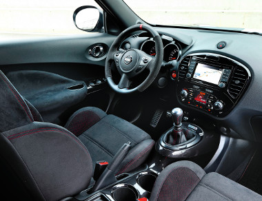 A már önmagában is extrém formát látványosan megvadítja az optikai tuningkészlet, de a sportosabb szabású kötények (elöl LED-es nappali menetfénnyel, hátul F–1-es stílusú ködzárófénnyel morcosítva) egyben a felhajtóerőt is hatékonyan csökkentik. További hatásfokozóként szigorú hűtőmaszkot, küszöbtoldatokat, tetőspoilert, piros tükörházakat, 18 colos alufelniket (225/45-ös abroncsok) és 10 centis sportkipufogót kapott a Juke.