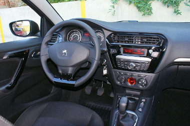 Belül egyébként csak a váltókar utal arra, hogy a PSA konszern kisautó-padlólemezére épülő autóban foglalunk helyet. Menet közben egyébként a leghangosabb zajforrás a váltás, a váltókar hangosan klattyogva mozog a fokozatok között, miközben nem kell erőltetni egyáltalán. Itt nincs játékosan összekevert műszerfal, mint a 208-asban, épp csak a lakkfekete középkonzol utal arra, hogy mai autóban ülünk. Navigáció még felár ellenében sincs, az ablakemelő kapcsolókat a váltókar előtt, a padlón találjuk (a hátsókat megismételték a könyöklő mögött), a kézifékkar mellett van a rádió vonal- és USB bemenete.