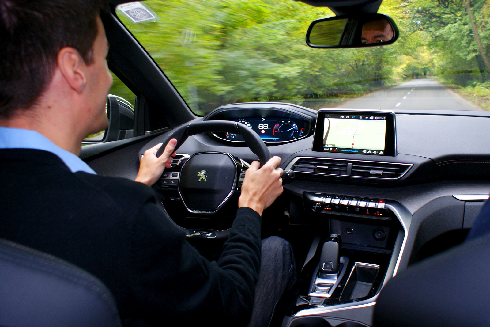 Egy rövid közúti körre sikerült elvinni a 180 lóerős dízelmotorral és automatikus váltóval szerelt GT csúcsmodellt, a csak itt elérhető kétszínű fényezéssel, ahol nem csak a tető kap fekete fényezést, de a hátsó ajtó közepétől kezdve a karosszéria többi része is. Jól néz ki, hogy az egyébként fekete betétbe rejtett hátsó macskakarom hátsó lámpák így még jobban belesimulnak a környezetbe. A vezetőülésben helyet foglalva óriásnak érzi magát az ember, a kis átmérőjű kormánykerék kifejezetten mélyen van, felülről nézek rá nemcsak a műszerfalra, de a motorháztetőre is. Alul és felül is kiegyenesítették a volán karimáját, egyébként jó fogású a perforált bőrrel és díszvarrással ékesített GT-kormány, de elég érzékeny, úgyhogy nem árt óvatosan forgatni. Márpedig sok dolga lesz vele a vezetőnek, ha nem csak autópályán közlekedik vele, de mondjuk megpróbál a magyar mellékutakon közlekedni: patttog az úton a 3008-as, még egyenesben is le akar esni az aszfaltról.