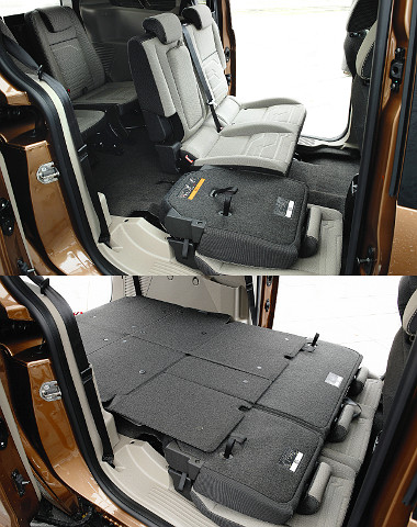 A kétoldali, nagyméretű tolóajtókon keresztül kényelmesen lehet beszállni hátra, a rövid és a hosszú változat utastere azonban másképpen variálható. A Tourneo Connect 60:40 osztású üléspadjánál először ledönthetők a támlák, azután előrebuktathatók vagy teljesen kiszerelhetők az ülések, így a csomagtér 1029-ről 2410 literre bővíthető. A Grand Tourneo Connect esetében egy-egy mozdulattal a padlóba lehet hajtogatni a második üléssort, akárcsak a 88 900 forintos felár ellenében rendelhető harmadikat. A két „pótszék” egyébként sínen csúsztatható előre-hátra, attól függően, hogy lábtérből, vagy poggyásztérből szeretnénk nagyobbat. Ezenkívül az anyósülés támlája is lapjára hajtható, úgyhogy akár három méter hosszú tárgyak is szállíthatók a kocsiban. A praktikus részletekre ugyancsak nagy hangsúlyt fektettek: ötletes megoldás például, hogy a négy 12 voltos aljzat közül a műszeregység felhajtható árnyékolója alá került az egyik, de hasznos pakolórekeszekből, csempészüregekből, palack- és italtartókból is eleget terveztek az autóba.