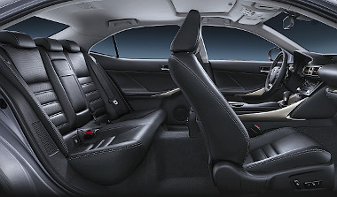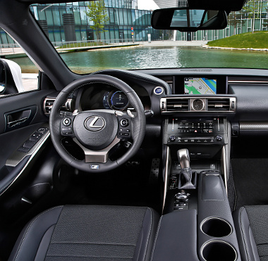 Méreteit illetően elődjénél 80 mm-rel hosszabb, 10 mm-rel szélesebb és 5 mm-rel magasabb az IS, a tengelytávon pedig 70 mm-t nyújtottak. Vékonyabb az első ülések kialakítása is, úgyhogy mindent összevetve 85 mm-rel tágasabb a hátsó utasok lábtere, ami a Lexus állítása szerint kategóriaelső. Akárhogy is, négy átlagos magasságú felnőttnek és csomagjaiknak kényelmes férőhelyet nyújt az autó. A belső kidolgozás makulátlan, a felhasznált anyagok minősége választékos, a feketén kívül akár bézs, szürke vagy vörös színű bőrkárpitozás is kérhető. Izgalmas és jól áttekinthető a markánsan tagolt műszerfal, a „szent kvarcóra” helyett végre ízléses analóg óra került a középkonzolra, a kétzónás klíma érintésérzékeny hőmérséklet-szabályozása pedig modern megoldás. A multimédiás és navigációs rendszer miniatűr joystick-kezelőszervét viszont továbbra sem zártam a szívembe, de a GS-hez képest legalább finomítottak a menürendszeren – utóbbi mellett immár a navigátor is tud magyarul. Az F Sport modellekhez pedig nem csupán határozott formázású sportülések, sportkormány és alumínium pedálsor, hanem sokkal látványosabb műszeregység is jár: az LFA szupersportkocsiéhoz hasonló, teljesen digitális kijelzőn gombnyomásra jobbra csúszik a körgyűrű (a középpontba helyezett fordulatszámmérővel együtt), és a felszabaduló helyen temérdek információ között lapozgathatunk.