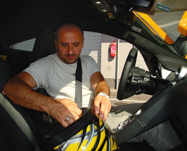 Három kör után jön a hőn áhított, kamaszos térdremegéssel kísért szerepcsere. Egy kupét választok, „jobb egyben” a szlovák Leonard Hrobárek GT-versenyzővel, aki közli is, hogy amint visszaérünk, ő visz engem körbe! Beállítom az ülést, minden paraméter középállásban (ez volt az ukáz), a hétfokozatú sebességváltó vezérlése automata programban, sisak fel, indulhatunk. A boxutcából kihajtva óvatosan gázt adok, a V8-as ikerturbós szörnyeteg pedig tolni kezd.