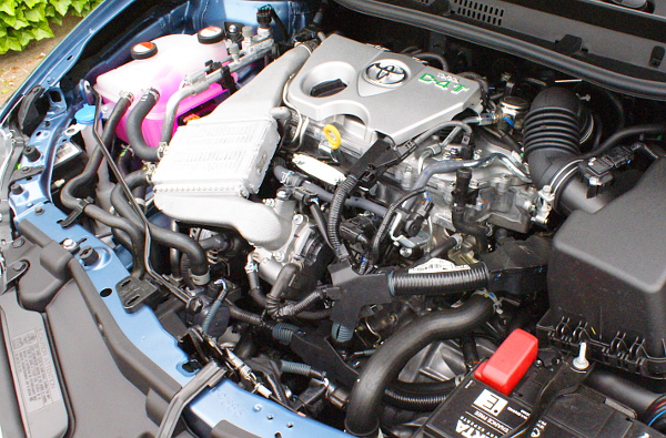 A Toyota mérnökei által kifejlesztett új, 1,2 literes D-4T benzines turbómotor piactól függően váltja, vagy (például Magyarországon is) kiegészíti az 1,6 literes Valvematic négyhengerest. A finom járás miatt döntöttek a négyhengeres felépítés mellett, a motorleállító csak azokon a piacokon széria, ahol CO2-alapú az adózás, mert a motor élettartamát csökkenti – a fokozatmentes váltó rendelésekor nálunk is megkapják a vásárlók. Új rendszert fejlesztettek a Toyota mérnökei, ami leálláskor rögzített pozícióban tartja a főtengelyt, így az indítómotorral történő indításkor rögtön az első munkaütemben dolgozni kezd az erőforrás. Egyébként a kipróbálható autókból hiányzott a motorleállító – alapjáraton rezzenéstelenül és tökéletes csendben üzemel az új turbómotor, könnyen azt hiszi a sofőr, hogy épp a Stop menü aktív. Kis turbómotorról lévén szó, ha 1500/perc alá esik a fordulat, vissza kell kapcsolni, de a hatfokozatú váltó könnyen és pontosan működik.