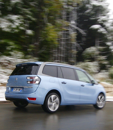 A normál és a Grand C4 Picasso elején épp csak annyi az eltérés, amennyi változás egy visszafogottabb modellfrissítés során történni szokott. Mivel az alapforma ugyanaz, kétszer kell odanézni, hogy az ember észrevegye a másként rajzolt alsó légbeömlőt és a szélesebb, egészen a nappali menetfényig érő krómbajuszt. Ehhez még hozzájön, hogy az A-oszlop jelen esetben az egészen a hátsó lámpákig ívelő tetővonal része.