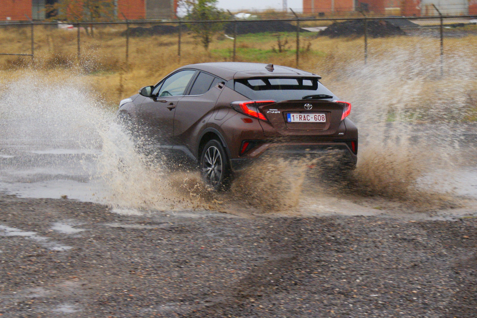 Az európai vezetőkre gondolva hangolták a felfüggesztést, utóbbiakról annyit érdemes tudni a Toyota kutatása szerint, hogy gyorsan vezetnek, beláthatatlan kanyarban sem hajlandók lassítani, és inkább levágják az ívet, minthogy fékezzenek. Olyan autóra van szükség, ami a vezető akcióira pontos és lineáris reakciókkal válaszol, ehhez szükség volt a korábbinál 65%-kal nagyobb csavarodási merevséget biztosító TNGA-C építőkészletre, amelynél új fejlesztésű MacPherson rugótstagokat alkalmaznak, hátul pedig a segédkeret jóvoltából az új Prius kettős keresztlengőkaros hátsó felfüggesztését kapja – annyi eltéréssel, hogy az első gumiszilent helyett golyóscsapágyat alkalmaznak. A felfüggesztés hangolása telitalálat, a fekvőrendőrökön és az úthibákon is profin lép át a C-HR, miközben nem érezni terjengősnek, pontosan irányítható a közvetlen áttételezésű kormánnyal. Az összképbe beletartozik, hogy mifelénk egyelőre csak kétféle hajtáslánccal lesz választható, és egyik se kimondott erőgép – kérdésre válaszolva a fejlesztők nagyon lobbiznak egy nagyobb teljesítményű motor mellett, de ezzel még vár egy keveset a vezetőség.