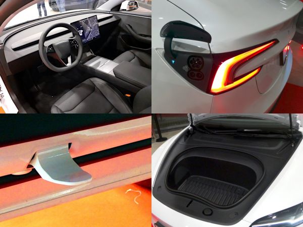 A szépségért meg kellett szenvedni a Tesla Model 3 modellfrissítés esetén is. Azzal, hogy a hátsó lámpák már teljes egészében a csomagtérfedélen helyezkednek el, a lökhárítóban levő fekete betét szélére is apró LED-es lámpákat szereltek, hogy azok átvegyék a világítási funkciókat, amíg a csomagtérfedél nyitva van – immár mindkét oldalon van emelőmotor, ami megbízhatóbb működést ígér még mostoha időjárási körülmények között is (odafagy a gumitömítéshez az ajtó…). Karcsúbb lett az első fényszóró is, ezenkívül annyi változást lehet észrevenni a karosszérián, hogy az ajtók alján van egy fém nyelv, amely a küszöbön kialakított lyukba csúszik be – oldalütközésnél ez sokkal jobb védelmet biztosít a bent ülők számára.