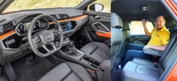 Szemlátomást sokat dolgoztak rajta, hogy ne csak hűvösség áradjon az autóból, például narancssárga Alcantara-betét is kérhető. A színes dekorok nélkül kimondottan rideg hatást kelt a belső, amelynek minőségét egyébként nem érheti kritika. Az autó technokrata jellegét hangsúlyozza az opciós, vetített kijelzős műszerfal és a tűéles képű központi rendszer, de itt a középkonzol nem egy nagy érintésérzékeny felület (mint mondjuk az A6-osban), a klímapanel hagyományos gombokat kapott. A minimalista stílus jegyében a Q3-asnál is elbúcsúzott az Audi a forgókapcsolós világításvezérléstől, manuálisan nyomógombbal aktiválhatjuk az alapáron LED-es tompított fényszórót. Ami a szolgáltatásokat illeti, pár évvel ezelőtti felsőkategóriás limuzinok is megirigyelhetnék a Q3-as tudástárát. Egyrészt számos vezetéstámogató rendszerrel látták el (pl. dugóasszisztens), másrészt hangvezérlés és „okos” navigáció jellemzi. Utóbbi a korábbi útvonalak alapján felismeri a vezető preferenciáit és ennek megfelelő útjavaslatokat is tesz.