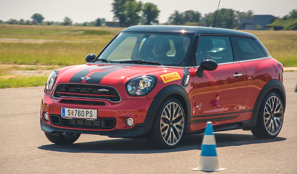 A másik feladaton, a meglehetősen szűre szabott kikerülési manővernél és az azt követő szlalomnál még a régi, azaz 1,6 literes, 218 lóerős motorral és összkerékhajtással – de ugyanúgy automatikus váltóval – szerelt Paceman és Countryman JCW-ket terelgettünk. A pár centivel magasabb építés ellenére ezek is nagyon pontos reakciókat nyújtanak, elsőre még egy kicsit óvatosan estem bele a kijelölt kapuba, aztán úgy voltam vele, repüljön csak a bója! Végül csak egy kicsit pöcköltem odébb, mert még 70 km/h tájékán is meglepően pontosan reagál a kormánymozdulatokra a szabadidő-autónak mondott Mini.