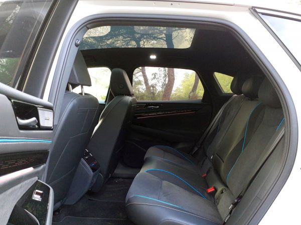 A kormányon még a nagy méretű, de legalább sok irányba billenő kapcsolókat használják – tekerés közben ujjbeggyel be lehet nyomni a tempomat-kapcsolót, aztán meg csodálkoztam, miért nem lassulok lejtőn gurulva, B, azaz extra motorfék fokozatban… Nincs egypedálos vezetés, még menüből sem lehet ilyet előcsalogatni. Számomra érthetetlen és fájdalmas volt, hogy nem vitték teljesen hátra az üvegtetőt. A hátsó utas feje felett már tetőkárpitot találunk, az üveg ez előtt arasznyival ér véget egy 3-4 centis peremben. Amikor a lapos ajtónyíláson előrehajtott fejjel átjutottam, hátradőltem, és elsőre jól bevertem a fejemet – ez a veszély 1,9 méteres testmagasságnál valós, a fejtér épp csak megfelelő ekkora termethez. Lábtér van bőven, de az ülőlap közel van a padlóhoz, már középtávon is kényelmetlen az utazás – alig várja majd az itt ülő a töltési szüneteket, amikor megmozgathatja a lábait.