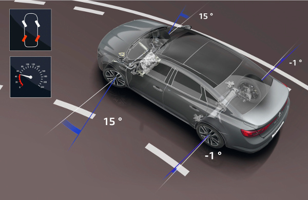 Van stílusa, franciává mégis a részletek teszik, mert nem is németes, inkább japános az összhatás. Sejthető, hogy a Nissan mérnökei a felelősek, nekik köszönhető az egész autót körüllengő minőségérzet és a jó ergonómia. Alacsony építésű karosszériájában ideális helyzetben ülünk, és erről csak részben gondoskodnak a 10 irányban elektromosan állítható, akár színátmenetes bőrkárpitozással is kapható, hűthető-fűthető masszázsülések. A japános hangulat a működésen is visszaköszön. Minden puhán és halkan teszi a dolgát, a csendről odabent többrétegű, hangszigetelő üveg, a „lármáról” 13 hangszórós Bose hangrendszer gondoskodik, mégis a vezetési élmény a Talisman elsőszámú vonzereje. Szerencsére megtartották a Laguna GT-ből a 4Control összkerékkormányzást, amikor a CFM padlólemezre váltottak. A gyorsan és hatékonyan működő rendszer érdekessége, hogy bárhol használjuk, érezhetően besegít a manőverezésbe. Lassan haladva a hátsó kerekei az elsőkkel ellentétesen fordulnak el akár 3,5 fokot, ami bevásárlókocsikra emlékeztető fordulékonysághoz segíti, és először szokatlan, finoman kígyózó mozgásban jelentkezik. Nagy tempónál már arra fordulnak 1,5 fokot, amerre az elsők, mi pedig úgy érezzük, bármilyen tempósan veszünk is egy kanyart, mintha csak egy láthatatlan kéz illesztené rá az ívre a Talismant, ahogy gyerekek játszanak a szőnyegen.