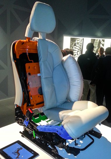 Ezért az első üléseket energiaelnyelő funkcióval látták el: az üléskeretbe olyan deformálódó elemeket építettek, melyek durva erőhatásra (pl. amikor az autó 60-80 centiről a földbe vágódik) elhajlanak az utasok súlya alatt. Így engedik az ülőlapokat 3-5 centivel lesüllyedni, mintegy gerinckímélő módon „kipárnázva” a becsapódást. Csakhogy az útelhagyásos balesetek közben, az autó pattogása miatt az utasok véletlenszerű irányokba mozdulnak el, márpedig nagyon fontos, hogy „landoláskor” megfelelő testhelyzetben legyenek. Ezért a hétszemélyes XC90-esben az összes biztonsági övhöz (a második sorban is állítható a szélső övek magassága) előfeszítés és erőhatárolás tartozik – az elülsőknél aktív, elektromos, a többinél pirotechnikai. Útelhagyás észlelésekor pedig az elektromos feszítő villámgyorsan (100 mm/másodperc) hátrahúzza az öveket és a megfelelő helyzetben rögzíti az utasokat. Amúgy ennek teszteléséhez a dániai Legoland vidámparkban is megtalálható Robocoaster „játék” adta az ötletet. A programozható robotkar össze-vissza rángatja az ülésben helyet foglaló tesztbábut, így szimulálva az árokba hajtás, a repülés és a földetérés közbeni testmozgásokat.