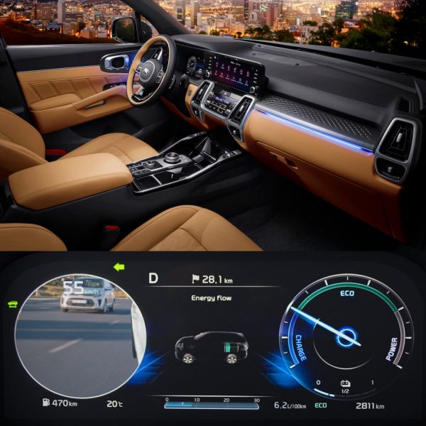 A berendezés is óriásit változott, az előd után alig lehet ráismerni. A magasra került, hosszúkás központi kijelző miatt a légbeömlőket lejjebb, az újjátervezett klímavezérlő mellé tették, és bizony a bumszli előválasztó kar is a múlté, az automatikus váltós verziók forgótárcsát kapnak. És ahogy egy ilyen kaliberű autótól elvárható, a műszerfal is vetített kijelzős (12,3 col). Csakhogy a Kia csavart egyet a dolgon: a vezető előtti kijelző jobb vagy bal oldalán élőkép mutatja, ha sávváltás közben egy másik jármű tűnne fel a Sorento holtterében. A képeket az autó külső visszapillantó tükreinek házába épített nagy felbontású, nagylátószögű kamerák közvetítik. A biztonsági színvonalat számos új funkció emeli, a fékasszisztens friss fejlesztése megakadályozza a többszörös ütközést (például ráfutásos balesetekben), a rendszer a légzsákok kinyílása után automatikusan fékez, így kerülve el egy esetleges második frontális, vagy oldalütközést.