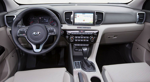 A vezetőülésben helyet foglalva látszik csak igazán, milyen fejlődésen ment keresztül a dél-koreai autóipar az utóbbi években. Ízléses és minőséginek ható a berendezés, s bár elsőre nehéz kiigazodni az azonos méretű gombok halmaza miatt, a sofőr felé fordított középkonzol, a szép rajzolatú órák és a jó fogású kormány miatt összességében csak elismeréssel lehet szólni a belsőről. Érdekes, hogy a Hyundai Tucson jóval konzervatívabb, a konszernen belüli szereposztás szerint egyértelműen a Kia szól a fiatalabb vásárlóközönségnek. Ha már szóba került a Hyundai: a Tucsonhoz hasonlóan a Sportage-ből is hiányzik a távolságtartós tempomat, ami azért meglepő, mert van sávtartó, holttérfigyelő, keresztirányú forgalomra figyelmeztető jelzés, vészfékező rendszer, fényszórósegéd, és táblafelismerő is. A magas üléspozíció, a nagy üvegfelületek és a méretes tükrök miatt könnyű manőverezni az autóval, de ebből a modellből sem hiányozhat az automata parkolórendszer, amely a be- és kiálláskor is a vezető segítségére lehet.