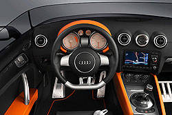 Különleges hatást keltenek a narancsszínű féknyergek, amelyek egyfajta vizuális kapcsolatot teremtenek a külső megjelenés és a belső tér között. A műszeregység, a kartámasz és a kagylóülések hátoldalának élénk színe sajátos stílusjegyként jelenik meg. A fekete bőrkárpitozású ülések is tartogatnak különlegességet: felületükbe lézeres eljárással különleges mintát dolgoztak, a TT-logó egyedi játékát kifejezetten a TT clubsport quattro számára tervezték.