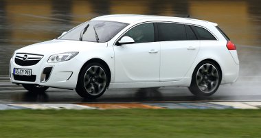A korlátozás nélkül 270 km/órás sebességet elérni képes Opel Insignia OPC (5 ajtó, kézi váltó) egyébként a hétköznapok során nem tud többet egy normál társánál. A menetpróba a Berlintől délre vezető, korlátozás nélküli autópályákon zajlott, ahol bizony nagyon szenvedett az autó 200 km/óra felett, csak hosszas kínlódás után tudtam elérni egy pillanatra a 240 km/órás tempót. Két tonnával nem lehet játszani! Ennél már csak az ablaktörlő szenvedését volt rosszabb nézni, ami úgy 200-tól alig tud a menetszél ellenében visszahúzódni a motorháztető fedezékébe. Mondjuk ez is jobb volt annál, mint hogy a Lausitzring oválpályáján 130-140 km/órás tempóval mentünk pár kört, mert akkora volt a víz…