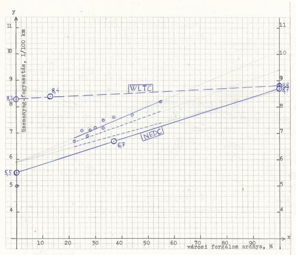 A kis körökkel az éves fogyasztásaimat jelöltem, a városi (Budapest) százalékos közlekedési arány függvényében. A legkisebb 6,7 l/100 km, 22 százaléknál, a legnagyobb 8,2 l/100 km (erről már volt szó). Az összesített átlag: 7,4 l/100 km, 36 százaléknál. Az alsó, emelkedő egyenes a jelenlegi műszaki előírás (NEDC) három menetciklusának a fogyasztásait, a városon kívülit (5,5), a városit (8,7) és a 37 százalékos aránynál mért kombinált vagy vegyes értéket (6,7) köti össze, jelezve, hogy a kombinált fogyasztás a városi arány növekedésével arányosan növekszik. A felső, alig emelkedő egyenes az új műszaki előírás (WLTC) hasonló jellegű függvénykapcsolatát jelöli. Itt a városon kívüli három menetciklus („közepes”, „nagy” és „extra nagy”) súlyozott átlaga szerepel (8,3) a bal oldalon, illetve városi fogyasztásként az „alacsony” menetciklus (8,8), valamint 13 százalék városi forgalomnál a kombinált vagy vegyes fogyasztás (8,4).