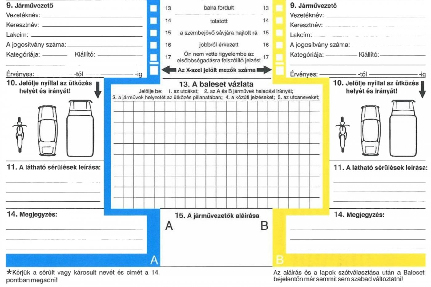 Kitöltéskor ajánlatos figyelembe venni a következőket: a 6. és 8. pontot a kötelező felelősségbiztosítási kötvény, a 9. pontot a jogosítvány adataival egyezően kell kitölteni; a 10. pontban a nyíl az ütközés irányát, a hegye az ütközési pontot mutassa; csak azokat a közlekedési helyzeteket (12. pont, 1-17. kérdés) jelölje meg kereszttel, amelyek az Ön járművére vonatkoznak; adja meg az Ön által megjelölt mezők számát. Soroljuk fel a baleset tanúit, közöljük lakcímüket. Fontos tudni, hogy a lap szétválasztása után a baleseti bejelentőt már nem lehet módosítani.