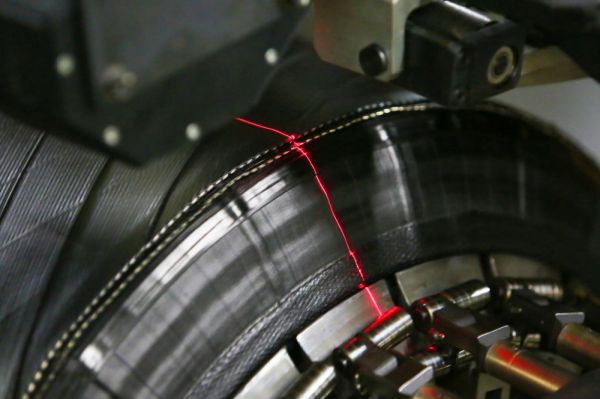 A nyers abroncsokat (már csak a vulkanizálás van hátra) előállító hatalmas gép is többszörös betáplálással működik, az oldalfal és futófelület mellett fém- illetve textilszövet, és peremkarika kerül itt egyesítésre. Ezzel kapcsolatban azt emelte ki Aba Mihály termelési igazgató, hogy rengeteg mérnöki munkaórába került, amíg sikerült pontosan előállítani azt a gumikeveréket, amivel már zavartalanul folyhat a termelés, és az operátornak csak a megfelelő betáplálással kell törődnie, nem pedig a gépbe ragadt anyag eltávolításával. A gyártás egyik nehézségét az adja, hogy alapvetően ragadós a nyers gumi, ezért vagy textilszövettel vagy szappanos oldat felhordásával „tartják távol” egymástól a már kész gumi-csíkokat. Egy-egy fém raklapon 1 tonnányi a mintegy fél méter magas gumihalom, ha ez egyszer összeragad, akkor mehet újra vissza a nyersanyag-előállító részlegbe, ahol aztán bekeverik a következő adag nyersgumiba – ha már fém- vagy textil kerül a gumiba, nem lehet ilyen módon újrahasznosítani, az hulladékként végzi. Olyan jól sikerült ez a feladat, hogy egy operátor egy 12 órás műszakban akár 900+ abroncsot is képes elkészíteni ezzel a berendezéssel, míg egy hagyományos, kézzel táplált berendezéssel ugyanennyi idő alatt 200-250 abroncsot lehet elkészíteni.