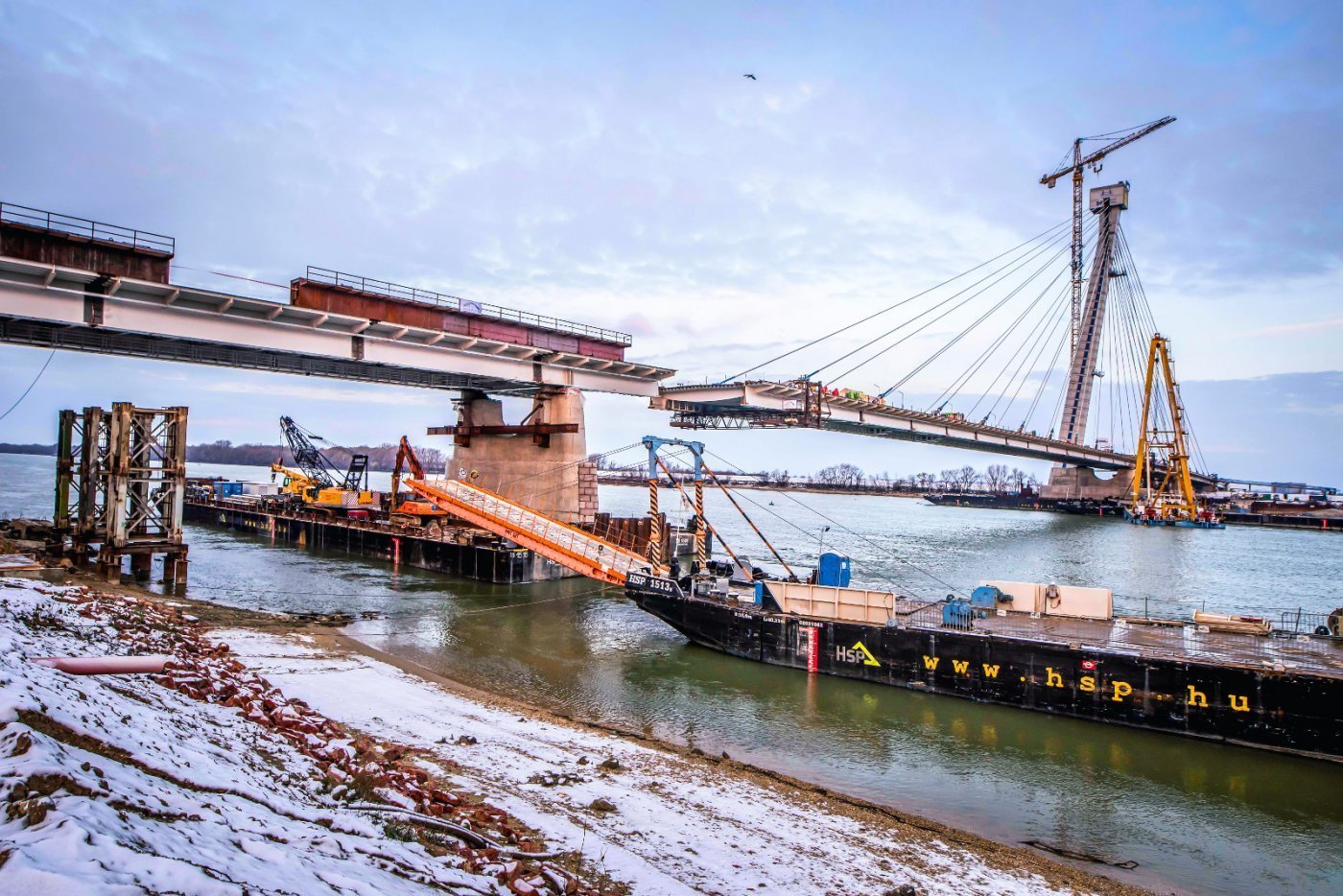 Komáromnál máris összeért az új Duna-híd, miután beemelték helyére a hídpálya utolsó elemét is. Az utolsó elemet a Clark Ádám úszódaru vitte a helyére és tartotta addig, amíg a szakemberek a rögzítést elvégezték. A szerkezet különlegessége a hídpálya Szlovákiához közelebbi oldalán elhelyezkedő ferde pilon, amely a rajta átfűzött kábelek segítségével tartja a híd felszerkezetét. A pilon teljes magassága 118 méter, ebből kb. 98 méter magas a látható rész. Az alsó 20 méteres darab a Duna közepén álló pillér belsejében helyezkedik el, annak alapjához rögzítve. A beruházásból a hídpálya szigetelése, az aszfaltozás, a helyszíni korrózióvédelmi munkák, burkolatjelfestések, a korlátok elhelyezése, a köz- és díszkivilágítás, a híd monitoring- és riasztórendszerének kiépítése, a hajózási jelzések és légiakadály-jelző felszerelése van még hátra – ezekre tavasszal kerül sor. A híd építése a műszaki átadás-átvételi eljárás lezárásával 2020. május végére fejeződik be, ezt követően indulhat meg mindkét országban a hatósági forgalomba helyezési – Szlovákiában használatba vételi – eljárás.