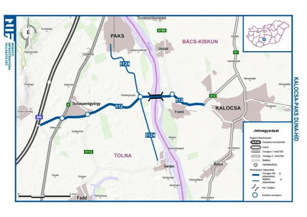 A többek között Paksot és Kalocsát is összekötő útszakaszon is új híd öleli majd át a Dunát. Még 2015-ben született kormányhatározat a híd építéséről, egészen mostanáig tartott a tervezési és közbeszerzési fázis. Jelenleg már a kisajátításoknál tart a projekt, a tényleges építkezés már idén indul, de a befejezés pontos időpontja még nem ismert. Összesen több mint 22 km közút épül, a nyugati oldalon az M6-os autópálya 124-es lehajtójához csatlakozik majd az 512-es számú főútvonal, amely jelenleg csak Kalocsát elkerülő útszakaszként létezik az 51-es úttól indulva, Foktő irányába. A háromnyílású mederhíd legnagyobb fesztávolsága 440 méter, a fel- és lehajtókkal együtt 946,2 méter hosszú hídon 2×1 sávos közutat és mindkét oldalon kerékpárutat alakítanak ki.
