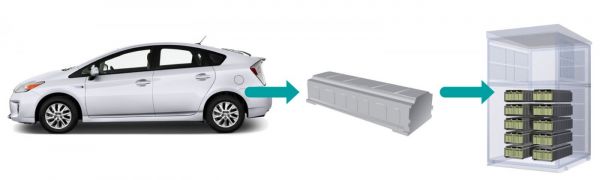 A hibridműfaj úttörőjének számító Toyota nyolc év garanciát vállalt a második generációs Prius akkucsomagjára, ám mint mostanra kiderült, ezzel is alábecsülték az energiatároló egységek tartósságát. Egy, az észak-amerikai piacot elemező kutatás során kiderült, hogy az első Prius-vásárlók 15%-a több mint 15 éven át használta autóját, majd ezt követően eladta – tehát még másfél évtized után is működőképesnek bizonyult az elektromos rendszer. Azonban az autók egy jelentős része nem ér meg ilyen szép kort: balesetet szenvednek, kinövi őket tulajdonosuk, esetleg kimennek a divatból. Bár a test értéktelenné vált, a hibrid szív ilyenkor még tovább doboghatna – és pontosan erre keresett megoldást a Toyota, amikor együttműködésre lépett a Nagoyában működő Chubu Electric Power elektromosenergia-szolgáltatóval. A két vállalat részben vagy teljesen elektromos járművek nagyfeszültségű hajtóakkumulátoraiból épít energiatároló rendszereket. Az ipari felhasználásra szánt berendezések kiválóan alkalmasak a megújuló (például szél- vagy naperőművekből származó) elektromos energia rövid távú tárolására, az energiagazdálkodás optimalizálására, a fogyasztási csúcsok kiegyenlítésére.