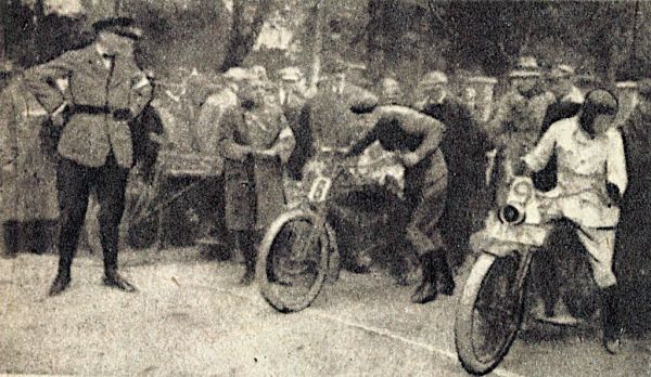 Jelenet az első svábhegyi (ma Szabadsághegy) verseny rajtjáról. A kép baloldalán Szelnár Aladárt látjuk, aki ebben az időben sokat tett a magyar motorsport fellendítéséért. Ökörszarv kormány, acetilén lámpa, jó széles „trepni” és természetesen jókora kézikürt voltak kellékei a versenymotornak