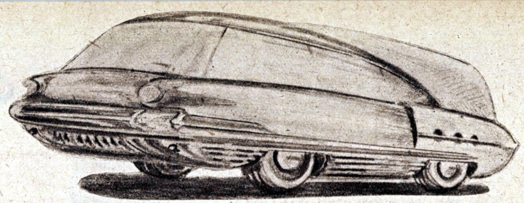 A szovjet emberek azonban nem ismernek akadályt. Dolmatovszkij-nak, az Autótudományi Intézet laboratóriumvezetőjének a jövő kocsijáról szóló leírásában már ezeket a szavakat olvassuk: meg vagyunk győződve arról, hogy eljön az idő, amikor a mi gépkocsi „fantáziánk” kézzelfogható valóság lesz. Ezek után ismerkedjünk meg mi is azzal a gépkocsival, amely a zuhanó vízcsepp formájához hasonlít és mérete nem nagyobb, mint a jólismert Pobjedának.