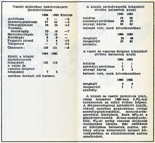 Aki ezeket a táblázatokat egy kicsit is jobban átnézi, több mindent kiolvashat belőlük. Például, hogy nálunk – átlagban – háromnaponként történik baleset vasúti átjáróban, s hogy ezek valamelyikénél minden héten meghal valaki. Méghozzá az esetek túlnyomó többségében a közúti jármű vezetőjének hibájából. Van, aki az egész családját magával viszi a másvilágra, van, aki élete végéig ágyhoz-tolókocsihoz között nyomorékká teszi utasait. De vannak szerencsések is, akik csak kisebb-nagyobb értékű járműveikből csinálnak filléres ócskavasat. A vonat alá hajtott lovakat, más igavonó állatokat pedig említeni sem szokás – nemhogy sajnálni – egy olyan országban, ahol sok embert ér ez a már-már mindennapos, csaknem megszokott tragédia. A tömeges balesetekre, egy busz-vonat ütközésre odafigyelünk ugyan, de a kisebbekre, az „apróbetűs rövid hírekre” már nem annyira.