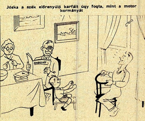 Jóska keményen fogta a szék karfáját és úgy ráhajolt, ahogy a motorra szokás. Jancsi minden mozdulatát utánozta a sámlin, neki nem volt karfája, hát csak a levegőt markolta s úgy figyelte, hogy Jóska tovább: