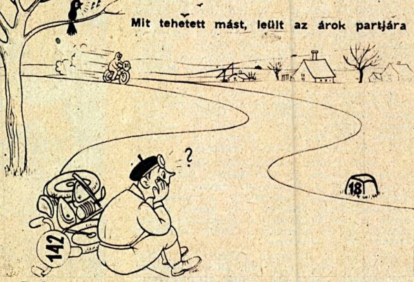 Sokkal hamarabb találkoztak. Délfelé lehetett, amikor Jóska motorja a nyílt országúton leállt. Rögtön leugrott róla és nézte, mi a baj. Rövidesen rájött: „gyertyaslussz”. Benyúlt a zsebébe a tartalékgyertyáért és akkor elsápadt. Otthon felejtette a tartalékgyertyákat az asztalon. Annyira vigyázott, hogy semmit se vegyen észre az apja, hogy a gyertya kiment a fejéből. Mit tehetett mást, leült az árok partjára. Majd kér valamelyik utánajövő „csepelestől”. Szomorú volt és bosszankodott. Most már oda a győzelem, hiába van már csak 300 kilométer hátra és nincs egy hibapontja sem.