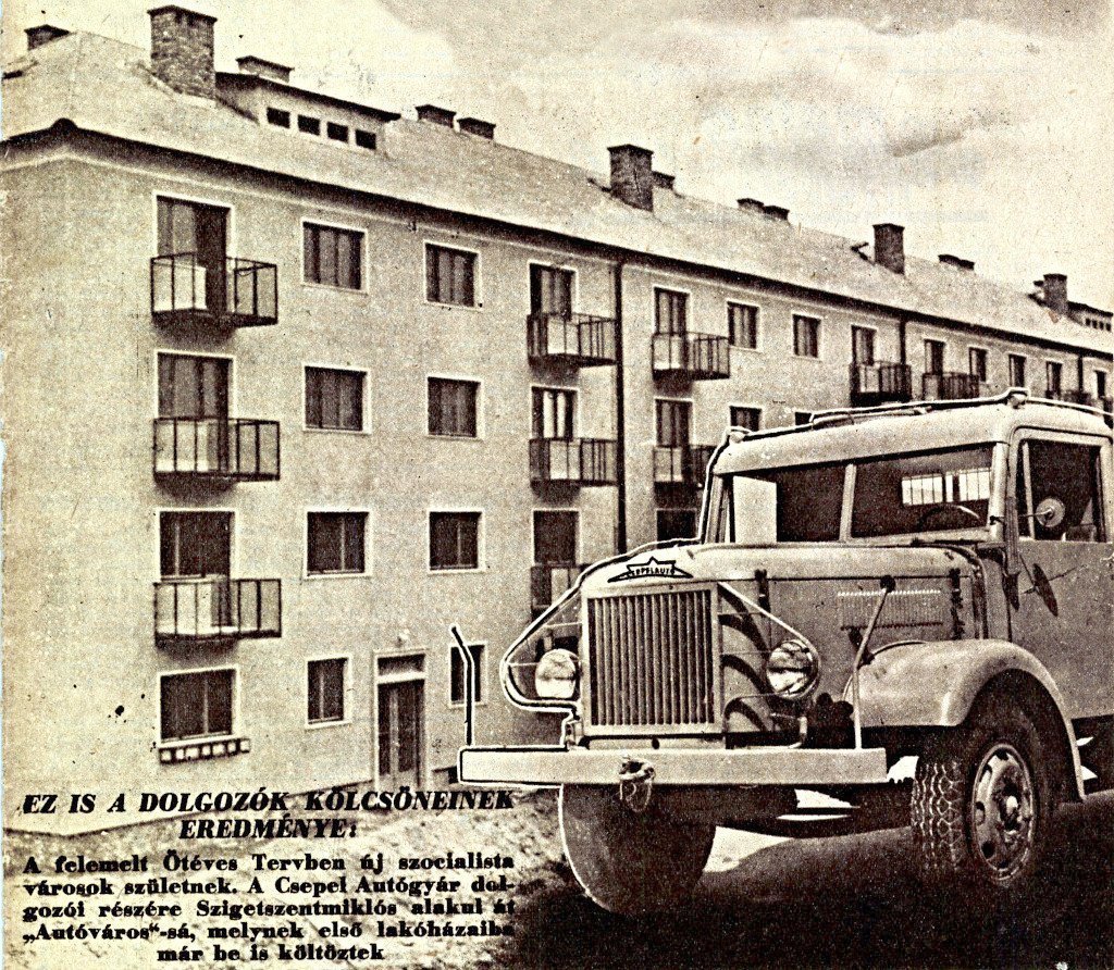 A térképen ezt a falut, – amely nyáron poros, télen sáros útjaival, homokdombjaival, szétszórt, apró házaival éppen olyan volt, mint a többi, – Szigetszentmiklósnak hívják. De a Csepel Autógyár dolgozói már úgy beszélnek róla: a mi „Autóvárosunk”. Néhány hónappal ezelőtt ugyanis, Pártunk Kongresszusán Gerő elvtárs, amikor felsorolta a felemelt Ötéves Tervben épülő új szocialista városokat, Dunapentele, Komló, Bodajk, Barcika, Almásfüzitő mellett megemlítette Szigetszentmiklós nevét is. És elmondotta, hogy a közelben lévő Csepel Autógyár dolgozóinak jövendő városában 1954 végére 1900 új lakás, 500 személyes munkásszálló, 3 új általános iskola, új mentőállomás, 2 új csecsemőotthon, 4 új óvoda, kultúrház, szülőotthon, strandfürdő, népfürdő, sportpálya, gyógyszertár épül. Így ígérte ezt a Párt és a Tervről szóló törvényében a magyar dolgozók állama.