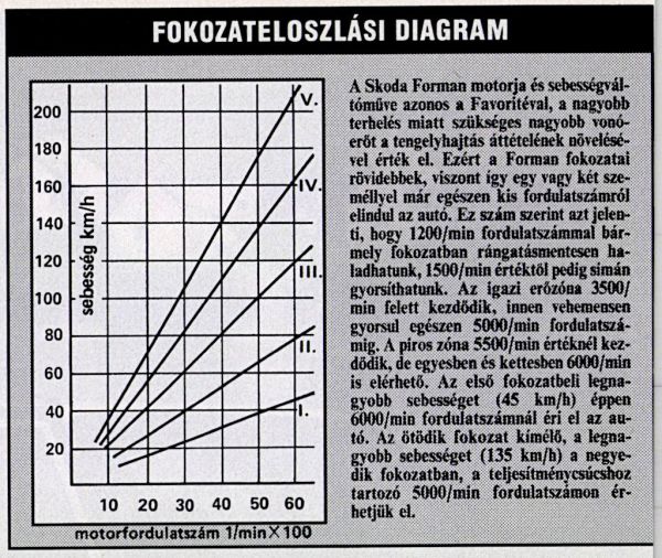 A Forman sebességváltójának öt fokozata úgy oszlik meg, hogy a legnagyobb sebességet negyedik fokozatban a legnagyobb teljesítményhez tartozó fordulatszámon éri el. (A legnagyobb sebességek az első három fokozatban: I. 45 km/h; II. 75 km/h; III. 110 km/h). Az ötödik fokozat kímélő, amiről úgy is meggyőződhetünk, hogy egyes autópálya emelkedőkön három személyes vagy úgy tudutnk 120 km/h-val felhaladni, ha visszakapcsoltunk negyedikbe, vagy ha a megelőző lejtőn egy kicsit nekifutottunk.