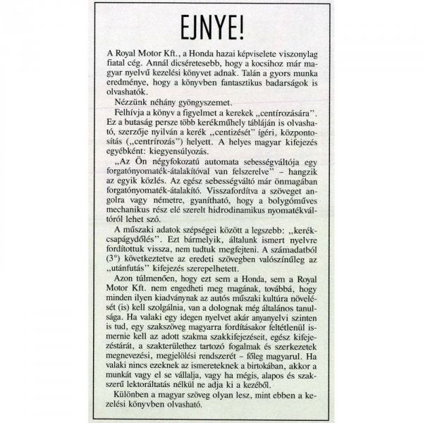 Ismerős arc a Honda magyarországi képviseleténél: Kővári György, a sokszoros magyar bajnok. Kezembe nyomja a kulcsot, pókerarccal elmagyarázza, hogy az autóban a bal oldali pedál a kuplung, a jobb oldali a gáz, a kettő között van a fék, aztán amikor már az autónál vagyok, még utánam szól: