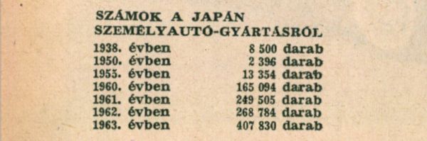 Úgy véljük, ez a néhány soros cikk és ez a néhány kép, amely Japán autóiról igyekszik hírt adni, azoknak is mond újat, akik jól tájékozott autósok hírében állnak. Arra nem is kerül sor, hogy valamennyi motoros járműről – a mopedtől az autóbuszokig – akárcsak szűk szavú említést tegyünk. Még a személygépkocsik közül is csak néhányat szerepeltetünk. Felsoroljuk azonban a mai jelentősebb gyártmányokat a Coni, Datsun, Hino, Honda, Isuzu, Mazda, Mitsubishi, Nissan, Prince, Subaru, Suzulight, Toyota és Toyopet márkákat, amelyek az 1963-64-es gyártási évben eddig 42 különféle személyautó-típust állítottak elő. Ezek között a legkisebbek 354 kcm-es, a legnagyobbak viszont háromliteres motorral kerülnek forgalomba.